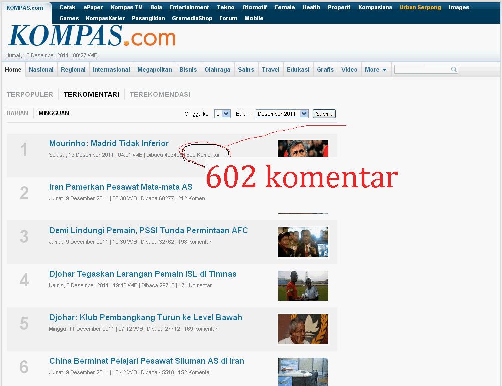 Pertama kalau kita buka kompas disini maka akan muncul tampilan seperti di bawah ini, terlihat artikel yang pada urutan nomor 1 "Mourinho: Madrid Tidak Inferior" memiliki 602 komentar dan Dibaca 423406.